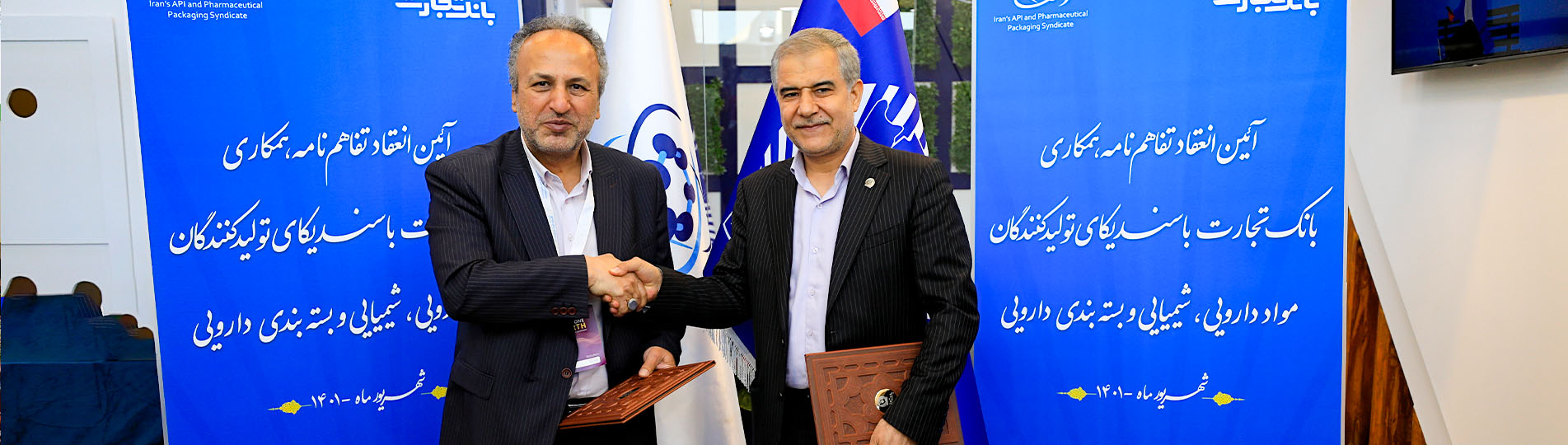 به گزارش روابط عمومی ایران‌مال، این تفاهم‌نامه چهارشنبه ۲ شهریورماه ۱۴۰۱ در راستای حمایت از تولید ملی و حرکت در مسیر خودکفایی دارویی به امضای فرامرز اختراعی رئیس هیات مدیره سندیکای تولیدکنندگان مواد دارویی و ابوالقاسم آموزش مدیر امور مشتریان تجاری و اصناف بانک تجارت رسید.